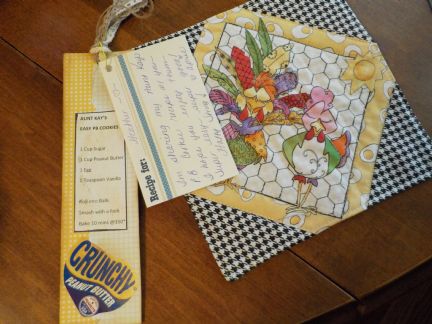 Sorry for the delay! Here's a picture of the wonderful book mark and pot holder from April: