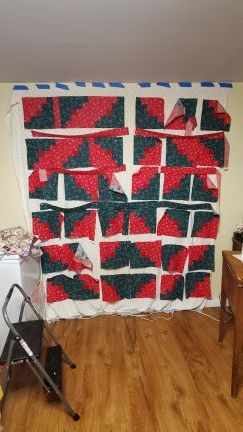 It's a Christmas miracle! I've been whipping out quilt tops much faster since moving downstairs. The blocks for this one were made by my friend's late mother. The only time I have to stop is when my cat demands attention. |