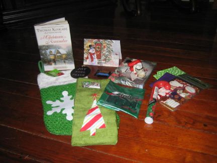 WOW! I got my stocking and gifts from Darlene today. I love everything in it. The stocking is green with a white snowflake and white fur trim! The gifts include a box of Christmas cards, A Thomas Kincade novel "A Christmas to Remember", a Joy Noel Peace wooden ornament, 2 fat quarters, a Christmas tree towel, A bag of Andes Mints, an M&M filled candy cane, a shelf-sitting Santa, a hershey's bar, a cute Christmas pin kit to make, some Christmas tags, and an "All is calm, all is bright" wall decoration. Thank you so much, Darlene! Here is a picture of most of the things except the box of cards. My camera ran out of battery power before I could add the cards, sit Santa up properly, and retake the picture. I will repost the picture tomorrow.