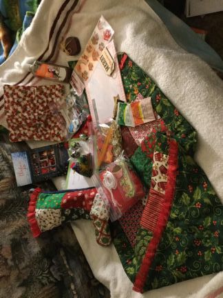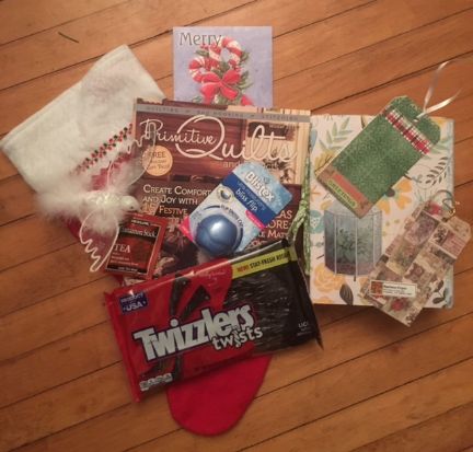 | LOL! Most is NOT wrapped that is in the stocking. I hope you enjoy it all! I enjoyed making the stocking. That way I can use scraps and make something nice for you. |