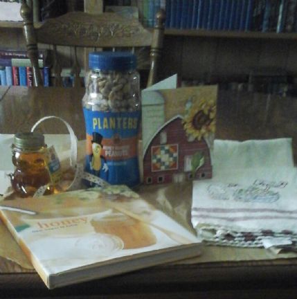 Well, today I received the "sweetest" package from my swap partner, Carole. She wrapped all up in brown paper packages. I love it. So pretty I hated to open them. But I am glad I did! She sent me a beautifully stitched towel and a cute little bear jar of honey, from Canada. I miss getting my brothers honey from there. Some honey roasted peanuts. I can sit and eat the whole jar of those. But I'll have to piece them out so they last longer. last but not least a book called Honey, from flower to table. Looks very interesting. Have to grab a cup of tea,with honey of course and sit for a bit to read it. Thank you so much Carole! Thank you for being my swap partner!!