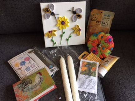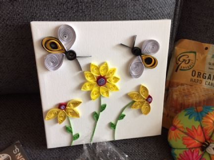 Shannon, everything was so fantastic!! Wow, you did an awesome job creating that quill bees and flowers picture too. It it just gorgeous!! Then there were hand rolled beeswax candles, Burt's Bees hand lotion and chapstick, delicious honey hard candies, a darling pin cushion, bee themed embroidery , and wild flower sees for attracting bees. Thank-you so very much for such a fun swap. I loved how you had it all packaged up too. I will definitely enjoy using all of my goodies. It was all very special!! |