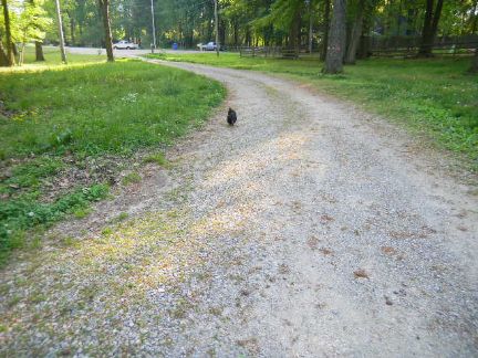 I love Roosters and Chickens, I don't have any, my 2 neighbors do. I love to hear the Roosters Cock-a-doodle-do in the morning! We Rooster and Hen sat for the Lovatos, they had a death in the family , in up state New York, I know nothing about them! We fed them, filled up their water and put them back in the Hen House at dusk for 10 days. Our other neighbor was raised on a farm in Nebraska, so they gave us pointers, as they were going out of town too, it was the week before Easter. Mrs. Lovato marked eggs with a sharpie, not to gather those.Mama was sitting on them. Here is a few Pictures. They tried to follow us home every day!! LOL!! I had cat sit, Dog Sat, Fish Sat, Bird sat, but never Chicken sat!! I learned a lot!!    I got attached to them. The sweetest thing was, they got home easter Sunday night and the Chicks had hatched!