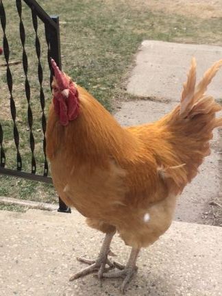 This is my Chester. He is a Buff Orpington and is so gentle. He loves to come up on the back door step and look in the screen door to see if I am around to give him treats. He has also discovered the cat food bowl I keep by the patio door on the deck, he really loves cat food. I don't allow him on the deck so have it blocked off most of the time. But every time he sees it open he takes advantage of it. He protects his girls very well and leaves all the best bugs for them. Always The gentlemen.