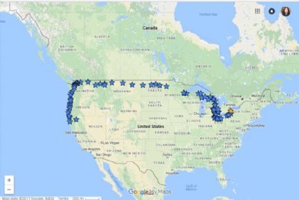 Here is his map of places - hum ... I guess he hasn't checked in in a while: https://www.google.com/maps/d/viewer?mid=1QsNtwa25iJu0jLatvgWD4WZnYlQ&hl=en_US&ll=44.93033449990389%2C-101.71659735000003&z=4