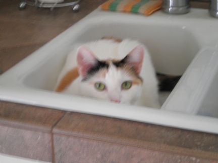 Here are pictures of my current kittie, Calli, and my former cat, Jake. Calli is my current kittie. She is a hunter - always bringing me pieces of birds and mice. I'm happy she is getting rid of the mice, but I wish she would leave the birds alone. She loves keeping cool in the sinks in the summer.