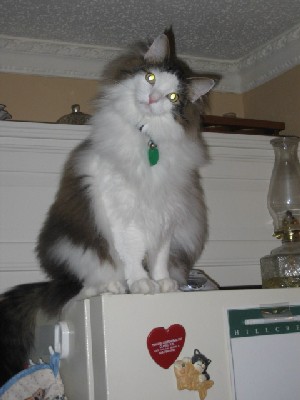 Jake was a man's cat - if I had a repairman in the house, Jake would be at his elbow, watching everything he did. Jake also loved riding in the car on my lap. I miss him. This picture was taken at my previous house, where he would get on top of the refrigerator to look down on everything. LOL!