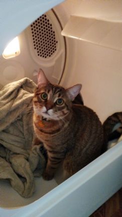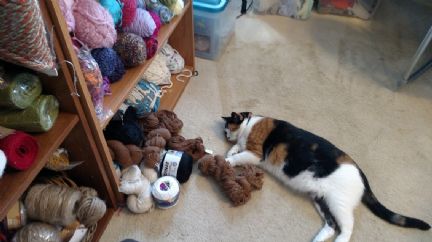 Here are my kiddos. Maize helping with the laundry, Raven peaking through the catnip, and Juliet getting into my yarn (needless to say I moved it). |