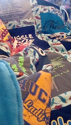 These are some photos of the tee shirt quilt! I love that fleece I found at walmart. It was fluffy, the perfect color and easy to work with. I just hope she likes it! I used two yards of a feathers print on a blue background to sash the "quilt", because the HS team was called the Indians.Besides she and her sister have always been interested in Indians. Her shirts include high school cheer, her friends volleyball team from a neighboring school, youth at church and her shirts from Beauty school. |