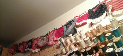 | Right now all my mini aprons are in one large plastic box. I need to bag them up by holiday to make it easier to change out the display of them to match the seasons. |