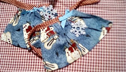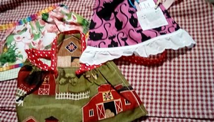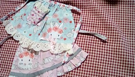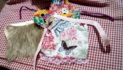 | Debbie - I hosted the mini apron swaps for over a year, then Grace (katmom) took them over for a few swaps. There are two printed patterns for mini aprons (Simplicity and Butterick, I think), but in truth, they are super complicated and involved and I didn't use them. We told swappers to make the half aprons about 4-5" wide at waist and 3-4" long and then add ties. I started skirts with piece of fabric 6" x 8" and hemmed on sides and bottom and gathered at top with waistband and ties added. Aprons came in various sizes, but all were cute with buttons, trims, lace, etc. added. Full aprons were same skirt sizes with added bibs and ties. We got a lot of fun aprons with various themes - spring/Easter, farmgirl, cowboy/western, Christmas, Patriotic, Fall, fancy/party, etc. |