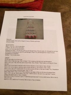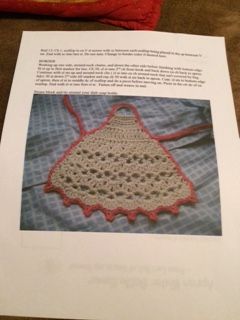 below are 3 pages of patterns: 2 pages for a crocheted mini apron, and 1 for a fabric one. The fabric apron pattern is free on line - it is a Lori Holt pattern. If you need them via email, please let me know.