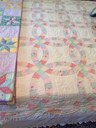 | Winnie that is lovely. Those colors look a lot like a wedding ring quilt my daughter made. I happen to be using hers at the moment. You got a great find even with the stains and I'm sure there is way to cover them and they are just as pretty. Have you tried the Tide pen? |