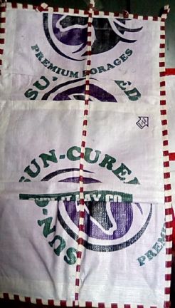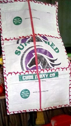 | My afternoon project on this cold drippy day was feed bags. My son buys his alfalfa cubes in woven plastic bags. They are from Idaho, near Yellowstone. Anyway, when he first switched from hay to the cubes he showed me the bags and said I should try to make something with them. So I made him a bag with pockets, which he was excited about, because he could keep some of his horse brushes, etc in the pockets. Then for Christmas I gave Julie and Bay each several tote bags made from the hay bags. So this afternoon I started again. |