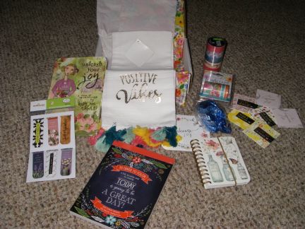 I wanted to share the wonderful package that I got from Sherry! Sherry, I think you read my mind with what I was needing...2 rolls of washi tape, little bookmarks (I've been trying to catch up on my reading), a "choose joy" coaster (a new motto that I have been trying to live by), a notepad for my purse (my granddaughter has filled my last one), a cute little handtowel, a book about joy, a coloring book (I KNEW there was a reason I bought that big box of crayons the other day) and CHOCOLATE!!! Thank you so much!!! |
