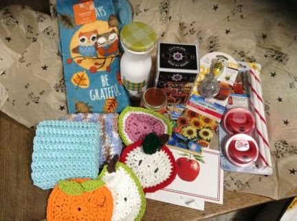 | Morning Denise, Thank you so much for the wonderful package. I took the picture on my ipad and having a few issues with that. So will get a picture on here soon. I just wanted to let you know that I got it and thank you so much for the tea and bee tea keeper, how did you know I needed a new pot holder and dishtowel so pretty. You did a lot of work on the crocheted fruit and dish cloths. Everyone wanted to know what was in the cute pig jar, I love it. Thanks so much |