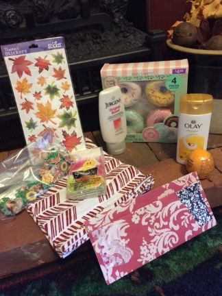 Happy surprise today from Marlee! It is still very much Summer down here with today being in the mid 90s again.. My box of goodies included all kinds of lovely bath products: donut shaped bath bombs, lotion, body wash, chapstick and purse size kleenex. Then there was a dark chocolate bar, that is currently recovering in the refrigerator, pretty fall leaf stickers and this very fun fall confetti!! I know I will enjoy using everything, plus I loved your beautiful handcrafted paper envelope with your note. Thank-you Marlee for being my swap partner!
