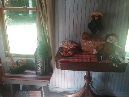I don't have everything out yet but here is one of my little fall setups. Sorry about the glare from the window.