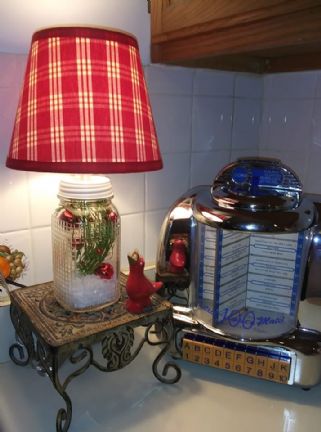 This year flew by! Congrats! Marlee!! December FGOTM! I decorated a few shelves today. Still worn out from Thanksgiving. Lily June stayed and spent the night with us. Her daddy picked her up Friday morning at 11. I always miss my Granny this time of year. All my vintage Christmas is mostly hers.  The jar in my lamp is one old coffee jar( Marilyn told me) my Granny had forever. She canned food in it. I've had it 43 years.