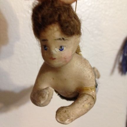 My most favorite Christmas ornament. My Grandmother brought this little angel and her two sisters from Hungary in 1904. She's gotten a little shabby through the years and has a mended broken arm. She is made of wax with glass eyes and real human hair. They were always hung near the top of the tree out of reach of little hands. Mom always said us girls were each to have one so when I came across them while cleaning out Dad's house last year I shared them with my sisters.