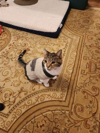 This is Mr. Miles in his new sweater. (He hates it...) He is about 12, we think, and rescued from our yard at our old house. He is the best cat in the whole world. ;)