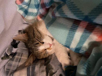 This is Tiny Penelope Frederick, goes by Tiny! When I was working at the school before my surgeries she was jus a baby. I looked out the classroom window and she was sitting outside and she looked up and I wanted her! There were several with the Mama, the Janitor caught them all and I took her home, she is so sweet and a pill. Darlene |