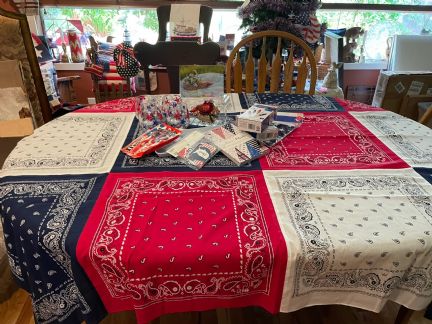 Look at all the 4th of July goodies that arrived in my mailbox. Love it all especially the tablecloth she made me and the sweet Cardinal. Thank you so much Debbie for everything. Yours will go in the mailbox soon.