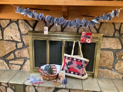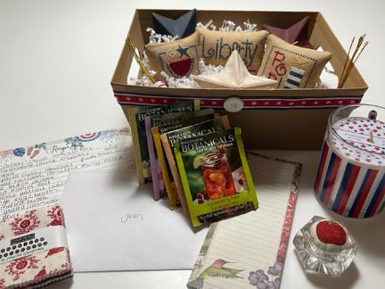 Debbie, I got to the post office today and your surprises were waiting for me!!! Thank you SO much…. I love everything!!! The garland that you made and the slow stitching banner are sweet , I love that you made them yourself. Straws, napkins, sparklers and a t shirt to wear to the 4th of July parade!!! Ribbon and tags and a gorgeous tote bag!!! And the beautiful basket!!! I’m adding it to my other red and blue baskets in my kitchen. I can’t thank you enough! .jpg?v 65206218) |