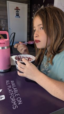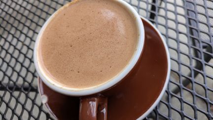 Beverage of choice-- Madagascar sipping chocolate from coffee shop in photos 1-3 for chocolate badge. This is sipped while Fallon is taking piano lessons at the other end of the strip mall because drinking coffee at 4PM is a recipe for disaster. I am trying to collect 100 beverages served in real cups after freaking out about microplastics, so now my phone is filled with pictures of them to keep track. I like that the crockery is chipped.