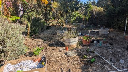 We got some strawberry towers in, started another compost Amazon box, swapped the broken down wheelbarrow for a capsized plywood dog someone threw over the fence that needs power tools to fit in our dumpster. I guess all those wheelbarrows of mulch helped a bit with the weeds.