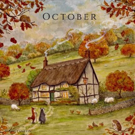 October Autumn leaves of red and gold That crunch beneath your feet. Pumpkins on front porches, Candy corn, and trick-or-treat. Tart and tangy cider, apples Ripened on the trees. A hint of winter coming On the chilly autumn breeze. - ecard verse, author unknown