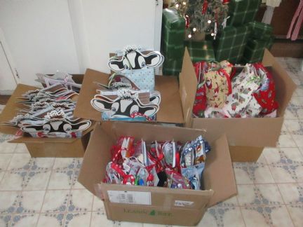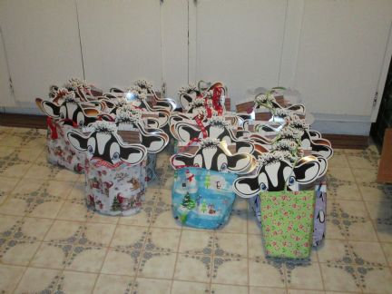 | I always put in a bar of my homemade soap, hot chocolate, and a candy cane. The rest varies from year to year depending on what supplies and time I have and what other people send. This year I crocheted washcloths and painted some little wooden ornaments. In the past there were ornaments, coasters, hand made cards, tissue holders for the little packs of tissues, lip balm, lotion, tea, fingerless mittens and ear warmers, socks, etc. The kid bags have coloring books, cow erasers, pencils, stickers, hot chocolate, candy canes, snowflake or tree soap, and this year they get a washcloth too. Last year was the first time I did some older kid bags. Those had soap, hot chocolate, candy canes, friendship bracelets, lotion or axe body spray (I did some for boys and some for girls) a dice or card game, and a walmart gift card. |