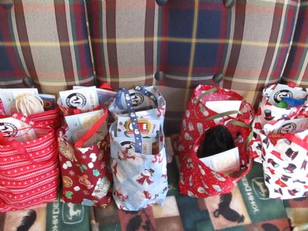 | I do make the bags. They vary in size depending on what fabric pieces I have. Roughly, I use 2 10 inch squares and cut 1 inch out of each bottom corner to miter the corners (helps the bags stand up and be filled easier but isn't necessary) then fold over a little bit at the top. I use ribbon for handles. Sometimes one handle on each side, sometimes one thicker piece of ribbon going from one side to the next making just one handle. I bet your grandkids would love doing this! |