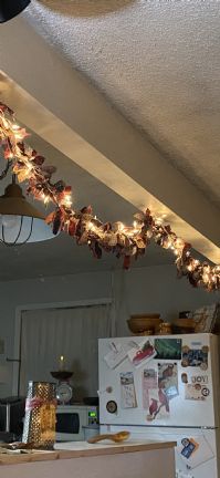 Debbie K. We still have a tree in our bedroom so the lights are still twinkling in my room of the house! :) We have a garland of white twinkle lights hanging in the open area between our kitchen and living room. I have tied fabric strips on the lights so it’s decor and fun lighting. See the picture below…but please ignore my message freezer front! :)