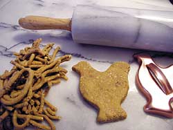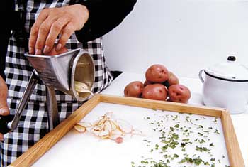 Grabbing from the three different foods, feed them through your grinder. They'll come out looking like strands of hair. Shape them into balls and roll them out onto a floured surface. They're ready to eat and very tasty! You can buy new graters at www.lehmans.com, 877-438-5346. Also, watch for them in antique and second-hand stores. I see them all the time. Find more hand-powered kitchen duty solutions in The Art of the Egg issue of MaryJanesFarm magazine. Click here to find out how to order your copy today.