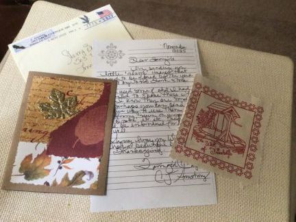 Thank you so much CJ for the wonderful card and red work fabric. I love it, now trying to decide what I want to make with it. It is very special. Beautiful card. Always thankful for my Farmgirls.