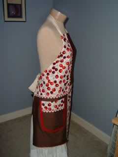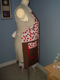 The fat quarter side is chocolate and cherries! It is adjustable because of the way the strapping system works. I had seen a vintage apron designed like this and ran across this Mary Mulari apron at the sewing machine repair shop. It is called: Mary Mulari's Newfangled Reversible Apron.