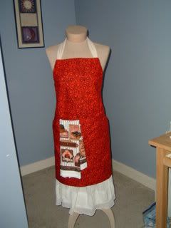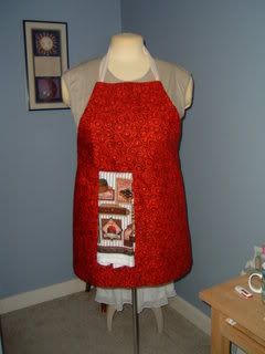 I am on my way to bed and don't have time to catch up. I really wanted to show ya'll an apron I've been working on. It is a Mary Mulari pattern. The pattern has patterns for dolls, kids and adults in the same package. This apron is very comfortable, fully reversible and will fit a size 6 to a 28. I have proof of this. I have it on my two sewing dummies which are sizes 6 and 28+ I am amazed that it works like this and still looks nice on either size! Each side is completely different. One is made with fat quarters the other is all one fabric. The red side is from new Christmas fabric that we got in at the store and I loved it. I used drapery cotton twill for the ties. Here is the apron...it is not quite finished, but it is after midnight and I am tired.