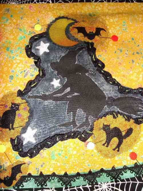 Here's the Witch..Appliqued down with black Rayon Seam tape using the embroidery floss, outlined the witch with a metallic gel pen, you can't see that the stars are pearlescent, appliques of the moon, bat and cats with the overlayer of black tulle.