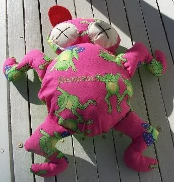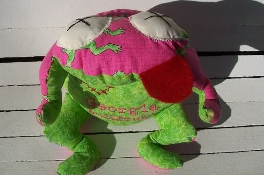 This was an old pattern from about 25 years ago. I finally have a litte time to try it out. The x's is the way the pattern is. They actually look better in frog-person. The x's are hand embroidered on and I have embroidered each child's name on their frogs. Still trying different things as I practice on them. Does anyone have different suggestions for the eyes? I am open to trying different things.
