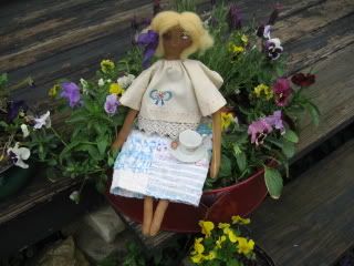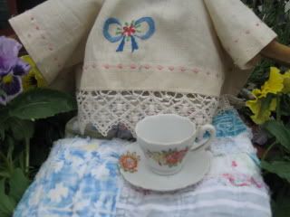Pansy's skirt is made from a wonderful olde time-weary quilt .. her blouse is a beautifully embroidered linen (both of which are from former generations) and she loves a morning cup of tea! Sister Mercy let her choose her favorite teacup and saucer from the cupboard to bring with her.