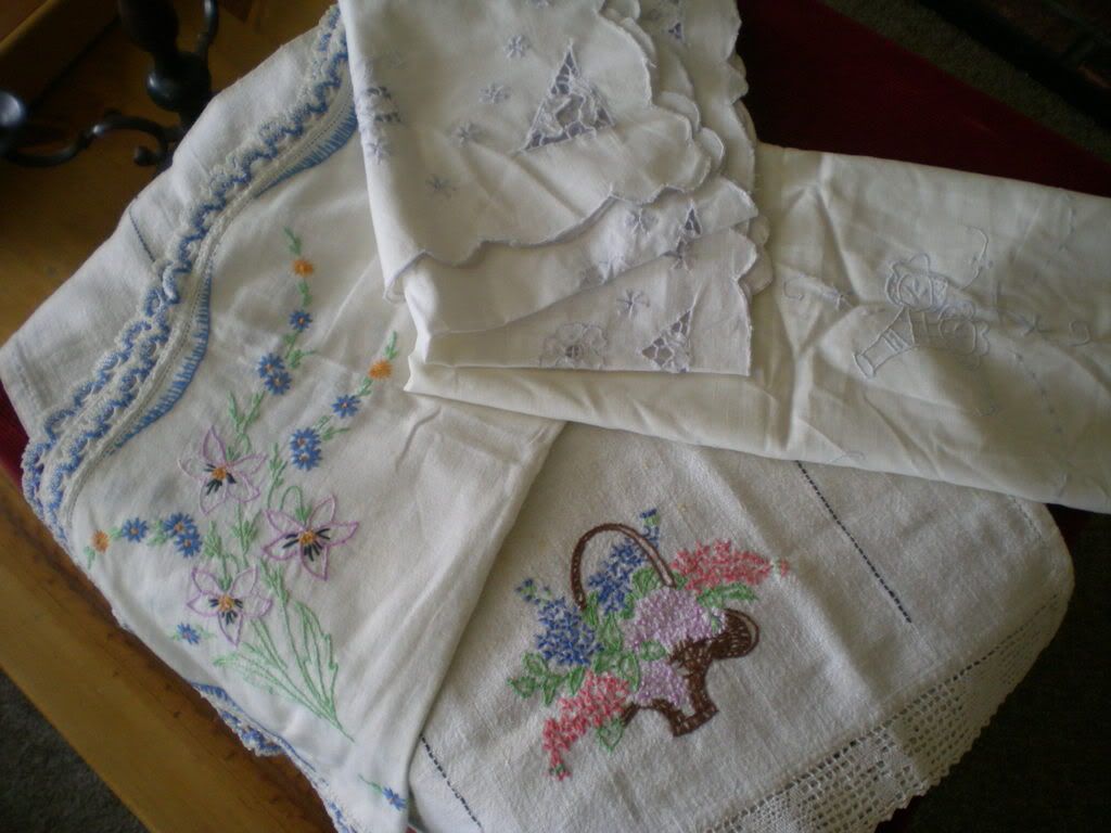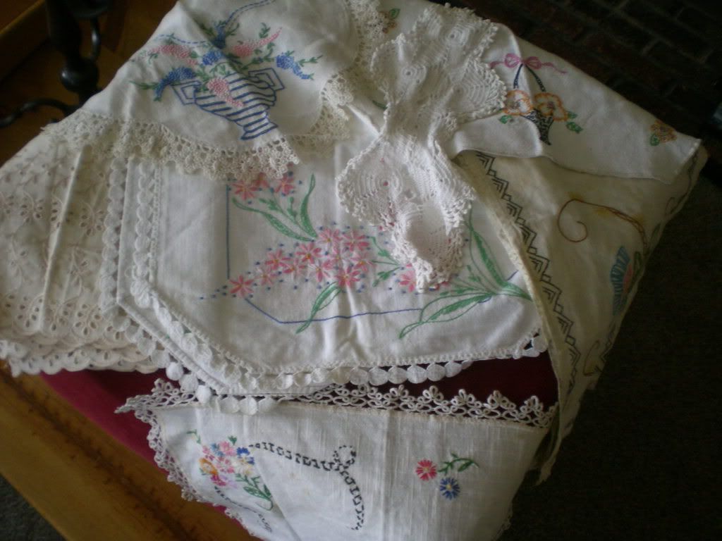 Here are 11 vintage linens and one wide length of lace (on the top left in the first picture)- some have age spots and small holes...all are lovely. Many different shapes and sizes.