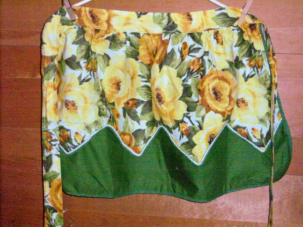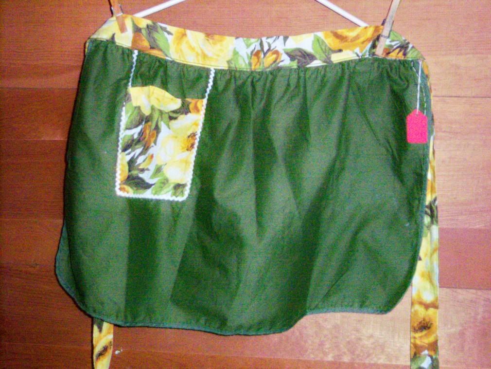 4. Green apron with yellow flowers. Pockets in bottom border across front.
