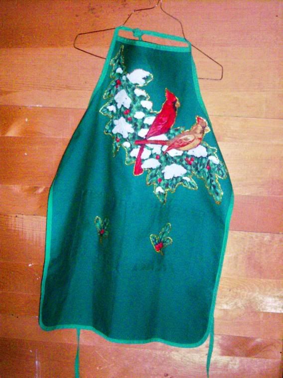 8. Male and female cardinal birds on full apron. Fabric paint adds dimension to snow on branches and gold trim around birds.