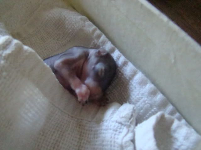 Yep, I have another "squirelly" story! Part of a squirrel's nest came crashing down into my backyard along with two tiny occupants. Hercules (pictured) and Dora. We have tried finding a rehabber to take them in, but no such luck as of yet. My daughters found information on the net on how to take care of them and then release them back into the "wild".
