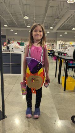 "Mentoring sister delegated this craft to Fashion Camp in the run up to Thanksgiving weekend. Fallon chose a cute turkey apron design and used it to help prepare Thanksgiving dishes at home, at granny's "NewThanksChristmas" combined holiday event, and at a Black Friday cooking camp at Chef School.