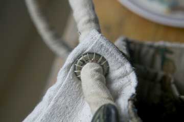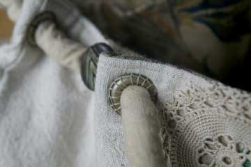 The purse you're wondering about is mine and of course I understand purse obsessions! I used a couple of feedsacks and several doilies to make it. It's also lined with two pockets sewn on the inside. First, I tea-stained everything using the directions in the latest issue. I made the handles using upholstery piping covered with leftover pieces from the feedsacks. I couldn't find grommets that worked so they are held in place with a blanket stitch around each one. Maybe a close-up photo would help you???? I may have some of the little circular doilies left and would be happy to send them to you. I was just in NYC (the city of purses) but no one had a purse quite like mine!
