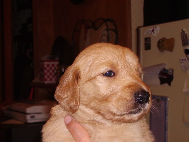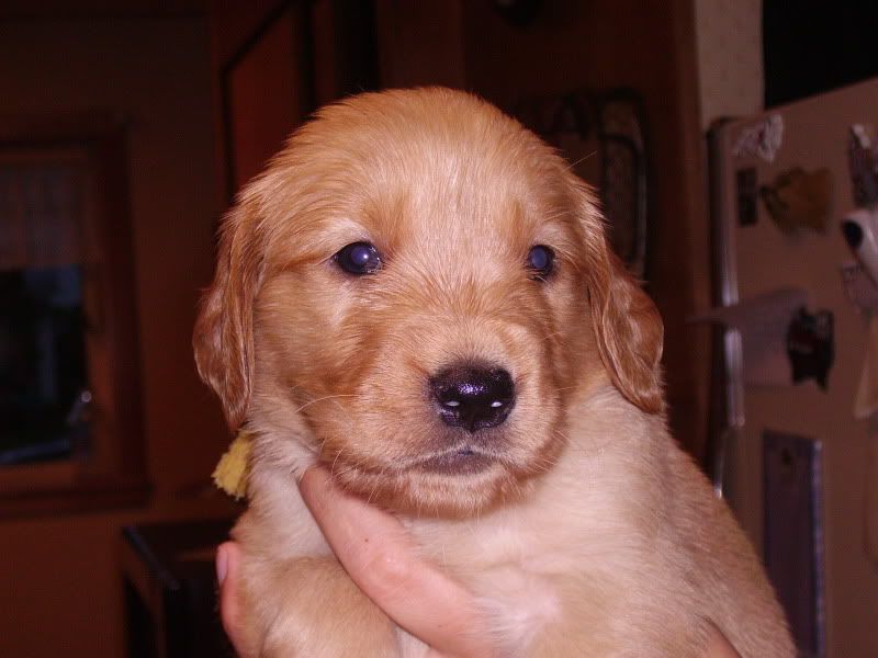 Way too cute and 13 OMG that must be fun!!! I have 3 doxie puppies that are almost 4 weeks old and haven't even started eating food yet. They are all under 2 pounds!!! hehehehe way smaller than yours!!!! Have fun!!! I just love goldens too!!!