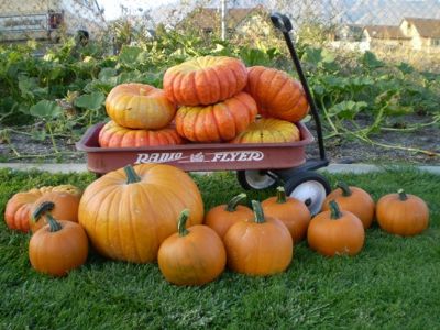 | The ones in the wagon are called Cinderella pumpkins. I only planted 2 plants and got that many. (Plus 3 on the other side of the fence!) |
