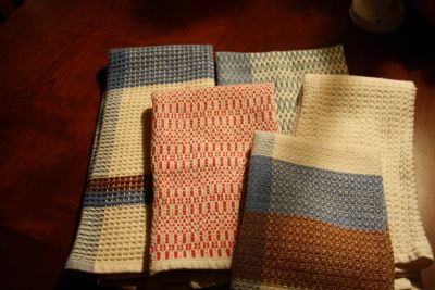 Here are some of the towels that I have woven. You can see the waffle weave and some overshot.